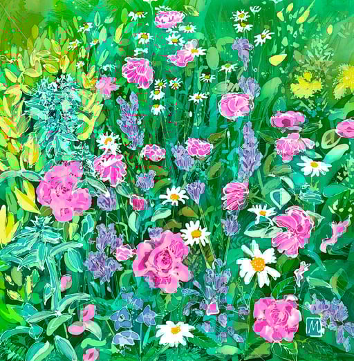 Inspired by Barnsdale Gardens this original was created in this year showing the variety of flowers all growing together in harmony, daisies, Gertrude Jekyll rose, cat mint and canterbury Bells..
